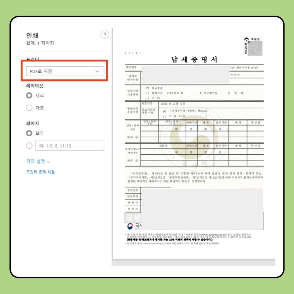 만약 PDF 파일로 저장하고 싶다면 프린트 화면에서
