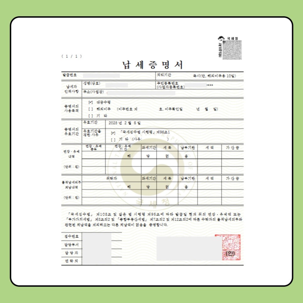 국세완납증명서는 말 그대로 국세를 완납했다는 것을 증명하기 위한 서류로