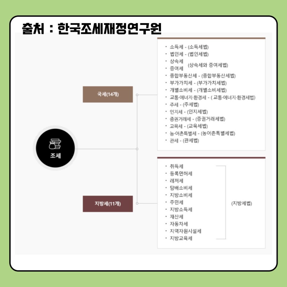 지방자치단체가 부과하는 조세인 지방세(11개)로 나뉘어져 있으며