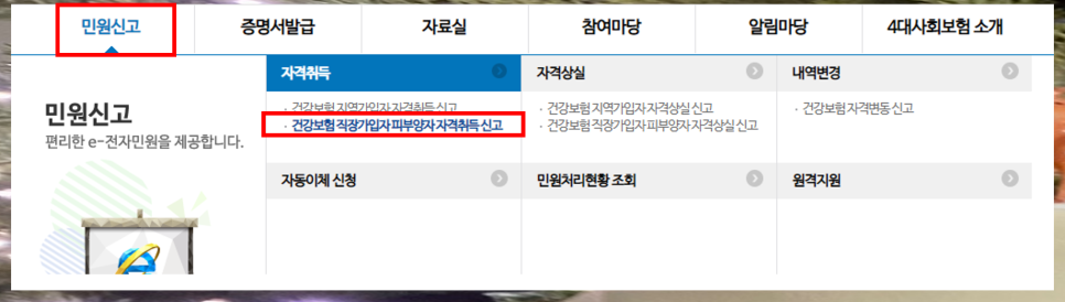 로그인 후 민원 신고 메뉴에서 자격취득 – '건강보험 직장가입자 피부양자 자격취득 신고' 메뉴로 들어갑니다.