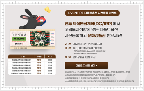 다음으로는 디폴트옵션 이벤트입니다. 앞서 살짝 언급한 바 있는데 디폴트옵션에 대해 보다 상세하게 설명을 드리자면 투자자가 따로 운용 지시를 하지 않으면 투자자의 성향에 맞춰 사전에 설정한 투자 상품으로 자동 매수되어 퇴직연금을 운용하게 되는 제도입니다. 사실 퇴직금이라는 게 무작정 놀리고만 있으면 돈이 불지도 않는 법인데 이렇게 투자를 통해 수익을 내고 그걸 노후 자금으로 활용할 수 있다면 좋은 방안인 거 같아 소개를 해드리고 싶은데요. 또한 한국투자증권에서는 사전 등록한 고객들을 대상으로 선착순 3천명에게 상품권을 지급해드리고 있다고 하더라고요. 위의 이벤트와 마찬가지로 2월까지 진행하는 이벤트이긴 하지만 선착순이라 최대한 빨리 참여하시는 게 유리하다는 점 알아 두시면 좋겠네요.