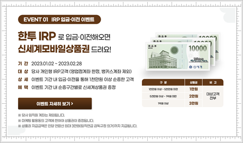 먼저 IRP 입금,이전 이벤트입니다. 2월 28일까지 진행되는 본 이벤트는 기간 내 1천만원 이상 입금 또는 타 증권사에서 이전하는 고객을 대상으로 하는 이벤트입니다. 금액 구간별로 신세계 모바일 상품권을 받으실 수 있는데요. 마케팅 활용에 동의를 해주시고 해당 조건을 충족하신 분들은 모두 상품권을 받으실 수 있으니까 참고하시면 좋을 것 같습니다.