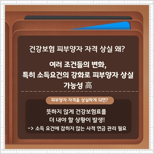 먼저, 건강보험에 대한 얘기부터 해보려고 하는데요. 건보료는 최근 그야말로 뜨거운 감자였습니다. 가장 중요한 포인트는 피부양자 요건이 개편됨에 따라 소득 요건이 강화된 것에 있습니다. 기존에 피부양자에 해당이 되었더라도 요건이 개편됨에 따라 자격을 상실할 가능성도 생긴 것이죠. 그렇게 되면 건보료를 더 내야 할 수도 있는 상황이 되기 때문에 다들 관심을 가지고 민감하게 지켜 보셨을 거라는 생각이 듭니다. 특히 소득 요건이 강화됨에 따라 변화가 생긴 것이 큰데요. 제 주변에도 부모님이 원래 건강보험 피부양자에 포함이 됐다가 그 자격을 상실해서 다른 방안을 알아보는 중이라고 이야기를 하시는 분들이 왕왕 계셨습니다. 이 글을 보고 계신 분들 중에도 이런 상황에 처하신 분들이 적지 않을 거라는 생각이 듭니다.