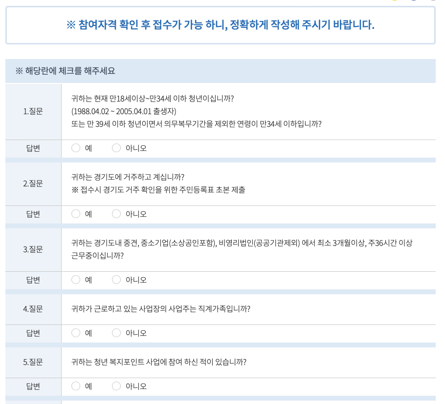 위에 보이는 모습과 동일한 홈페이지에 방문하셨다면 상단 메뉴에 [참여접수 > 청년복지포인트 접수] 순서대로 접근해주시면 다음과 같은 최초 설문을 진행하게 됩니다.