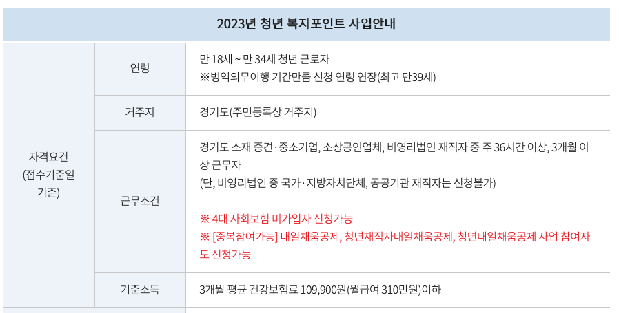 그럼 경기도 청년복지포인트의 자격 요건을 확인해봐야겠습니다. 글의 서두에 적어놓은 것처럼 경기도에 거주하는 만 18~34세 청년 근로자라는 기본적인 기준이 있긴 하지만, 그보다 조금 더 상세한 기준이 있으니 아래 내용을 참고해주세요.
