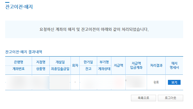 그래서 여기서 내가 따로 사용하지 않는 계좌가 있다면 계좌를 해지하고 잔고를 이전신청도 가능합니다.