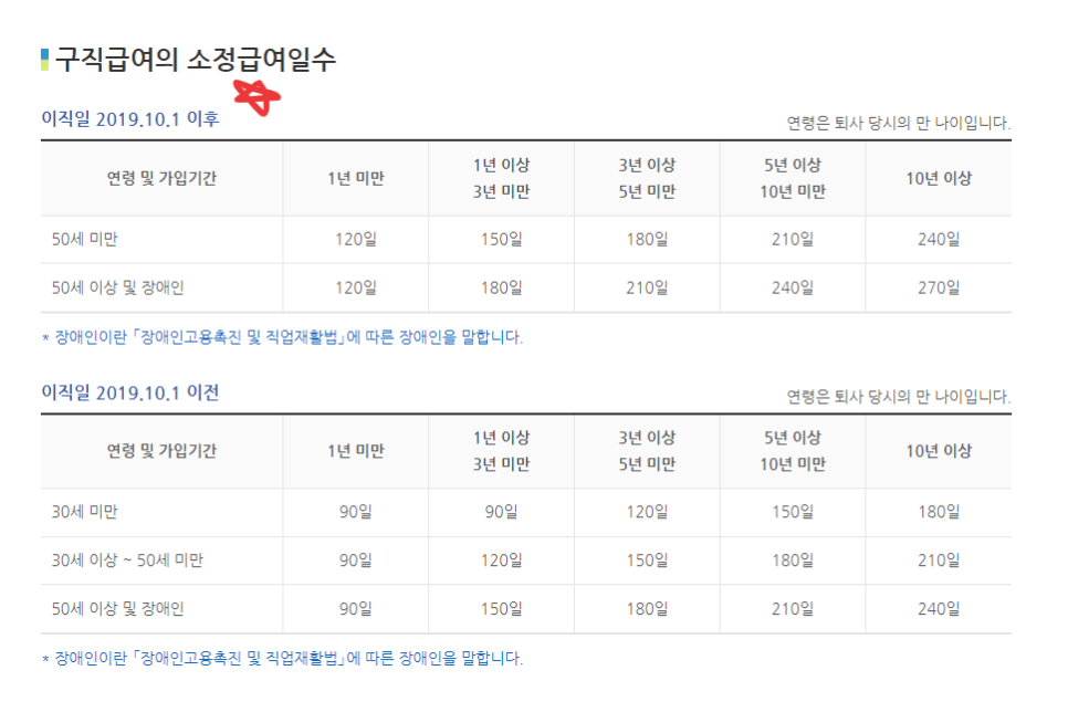 기간은 근무 일수와 나이 및 장애 여부에 따라 상이해집니다.