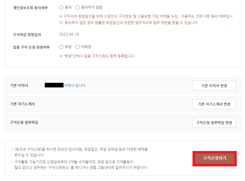 굳이 막 복잡한 건 없고 그냥 기본 이력서를 적어주시고, 구직 신청하기를 눌러주시면 됩니다.
