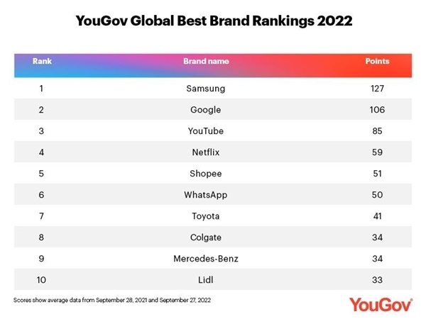 20일 업계에 따르면 글로벌 여론조사업체 유고브(YouGov)가 최근 발표한 `2022년 글로벌 최고 브랜드 순위`에서 삼성전자는 127점을 얻어 1위에 올랐다.