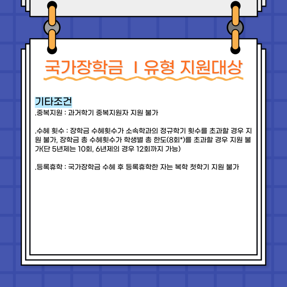 장학금 수혜횟수가 정규학기 횟수를 초과할 경우 지원이 불가하며
