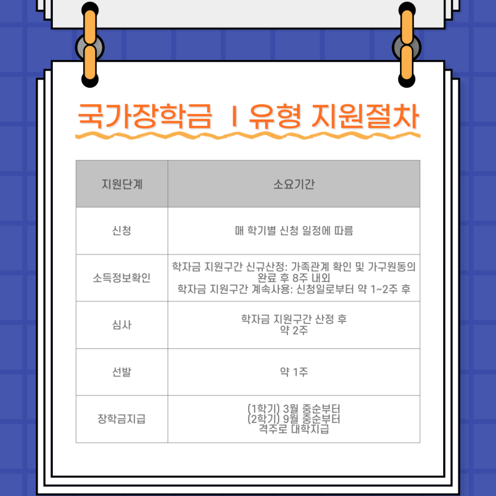 신청하시게 되면 소득정보확인, 심사, 선발, 장학금 지급의 단계로 진행됩니다.