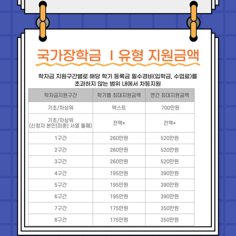 상기 이미지를 보시면 학자금 지원 구간별 학기별 최대 지원 금액과 연간 최대 지원금액이 나옵니다.