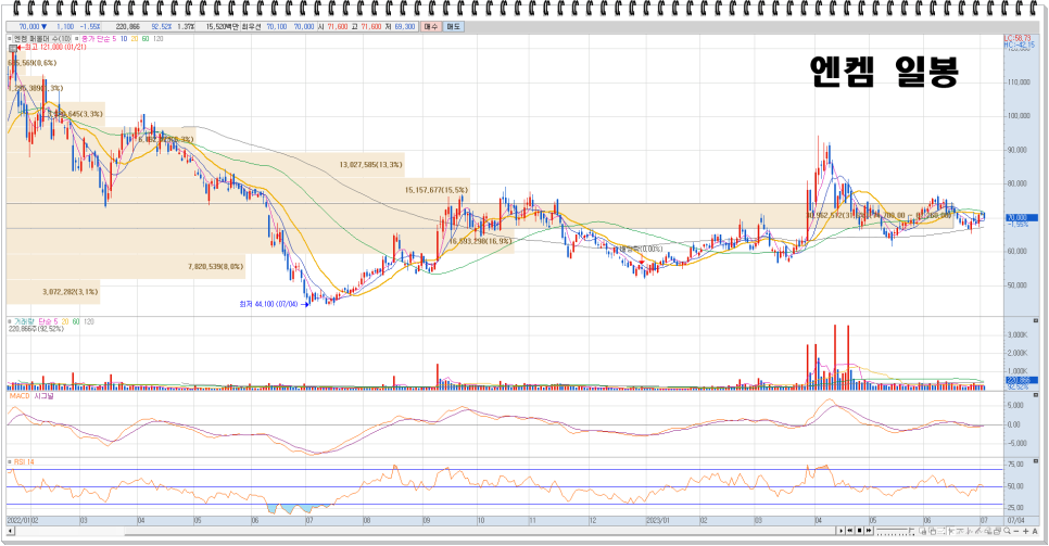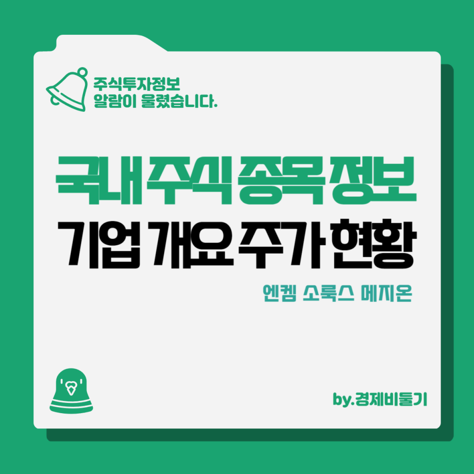 본 포스팅은 07.04일 장 마감 기준으로 작성 되었으며 금일은 엔켐주가, 소룩스주가, 메지온주가 현황 및 기업개요를 알아보도록 하겠습니다.