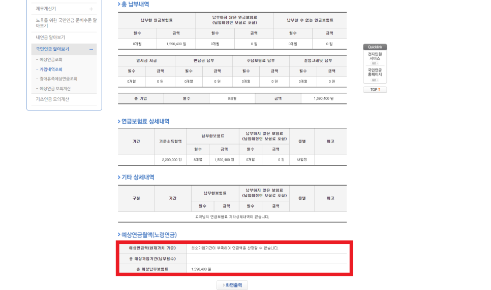 뭐 여튼, 최소 가입이 기간이 부족하다보니 연금액이 산정되지 않는다고 해요.