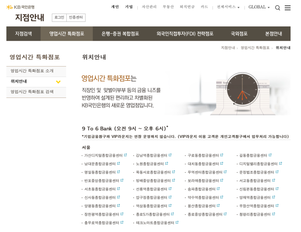 그리고 혹시 국민은행의 영업시간 특화점포라는 것을 알고 계신가요? 맞벌이 부부나 직장인 1인 가구 등등 국민은행 영업점에 방문해야 하는데 현실적으로 시간 내기가 참 어려운 분들을 위해 국민은행이 전국의 주요 거점에 단축된 영업시간이나 기존 영업시간과 별개로 오전 9시부터 오후 6시까지 운영하는 영업시간 특화점포를 운영하고 있습니다.