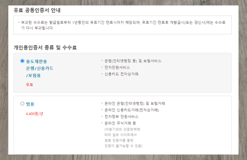 그 전에 공인인증서 종류를 안내드리면, 공인인증서에는 범용과 용도제한용이 있습니다. 2가지 인증서 모두 은행과 보험 서비스, 전자민원 서비스와 신용카드 전자상거래에서 사용할 수 있는데요, 가장 큰 차이는 온라인 주식거래에서 공인인증서를 사용할 수 있는가 입니다. 범용 인증서만 주식거래에서 인증서를 사용할 수 있는데 대신 년 4,400원을 써야합니다. 인증서 수수료는 카드 결제는 안되고 계좌에서 출금만 가능합니다. 범용 인증서를 발급하려면 데스크탑에서 해주셔야 합니다. 모바일앱은 용도제한용 인증서 발급만 가능해요!