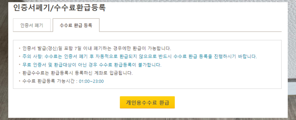 간혹 일회성으로 범용 공인인증서가 필요할 때가 있는데요, 꿀팁 알려드리면 발급하고 폐기하시면 됩니다. 인증서를 발급(갱신)하고 일주일 내로 폐기하게되면 수수료를 환급해줘요! 대신에 따로 환급 등록을 해주셔야 합니다. 공동인증서 페이지에서 수수료 환급등록 메뉴를 찾으실 수 있어요! 환급하면 등록한 계좌로 입금되니 사용하지 않는 범용 공인인증서 갖고 있지 마세요~~!
