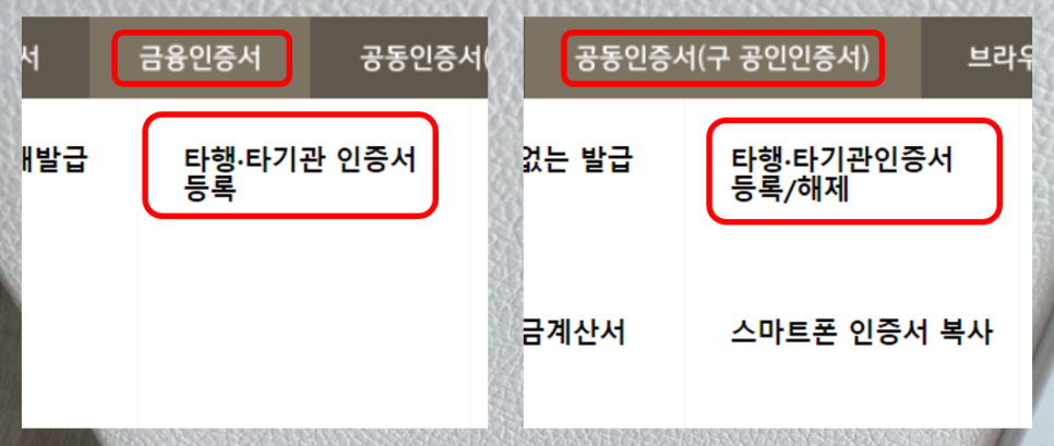 그 다음은 인증서가 필요한데요, 만약 다른 은행에서 발급받은 인증서가 있다면 국민은행에서 인증서를 발급받지 않아도 됩니다. 타행/타기관 인증서 등록 메뉴를 이용하시면 되는데요, 개인 인증센터 홈페이지에서 다른 은행에서 발급받은 금융인증서 또는 공동인증서 종류를 선택하신 뒤 ‘타행/’타기관 인증서 등록/해제’ 메뉴를 선택해서 이용하실 수 있습니다.