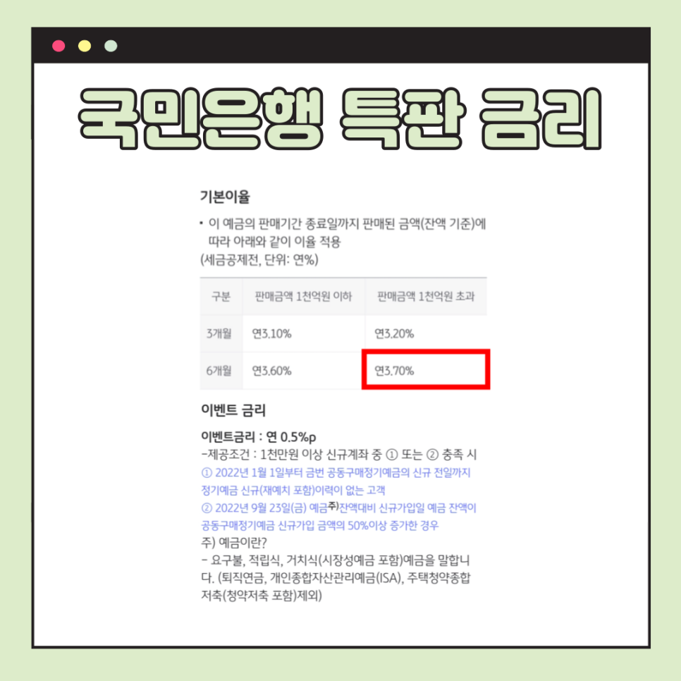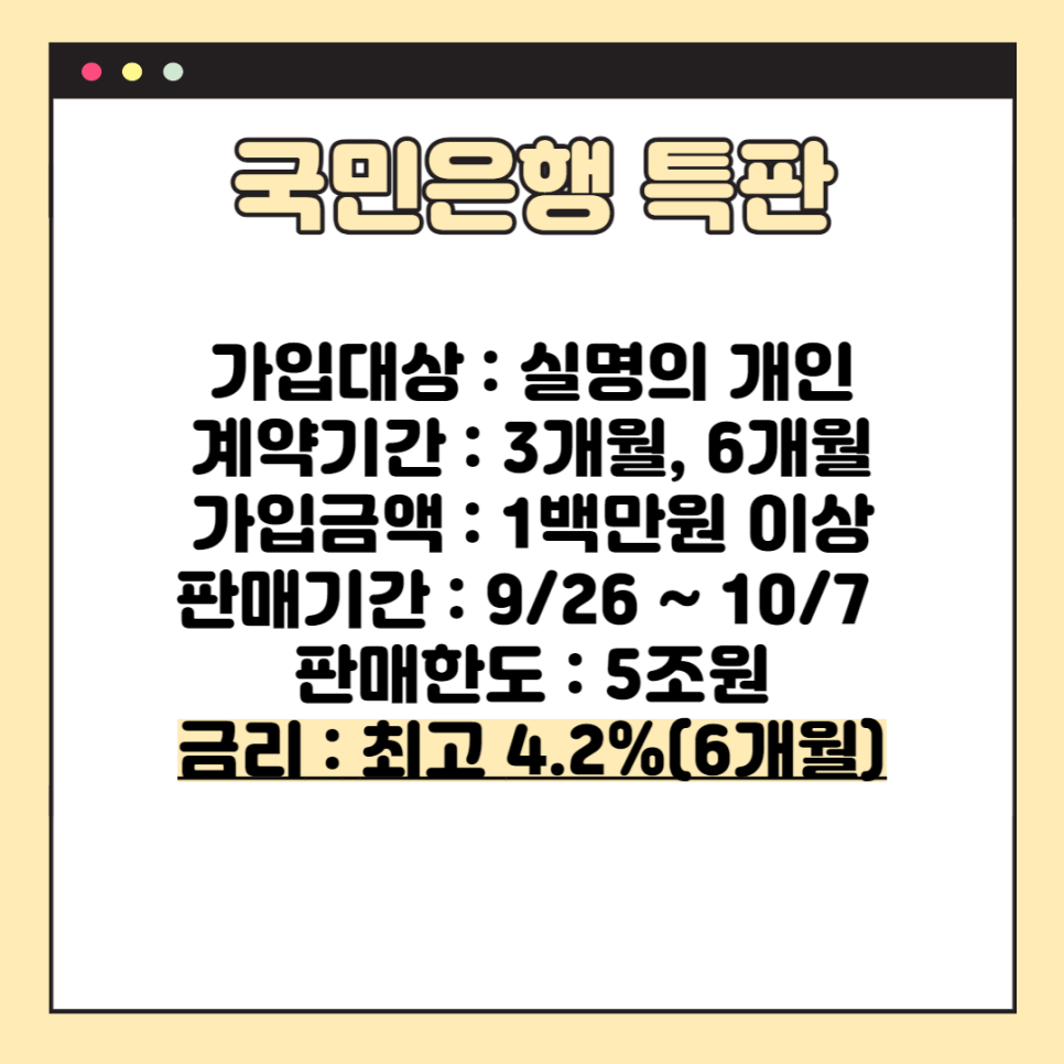 요새처럼 예,적금에 대한 관심이 높은 적이 없었던 것 같은데요, 공모주, 주식도 예전처럼 큰 수익을 가져다주지 못해서 주식 예탁금에서 은행으로 뭉칫돈이 빠져나간다는 뉴스가 연일 보도되고 있는 것과 관련이 있다고 생각합니다. 그래서인지 요새 고금리 기조가 계속되면서 저축은행이 아닌 시중은행에서도 저축은행금 고금리 예,적금 상품을 많이 만나볼 수 있게 되었습니다. 특히 오늘은 국민은행에서 10월 7일까지만 한정적으로 판매하는 초단기 예금 특판과 정기 예금 상품 중 고금리 상품으로 추천드릴 상품을 모두 정리해보려고 합니다. 그럼 하나씩 알아보도록 하겠습니다.