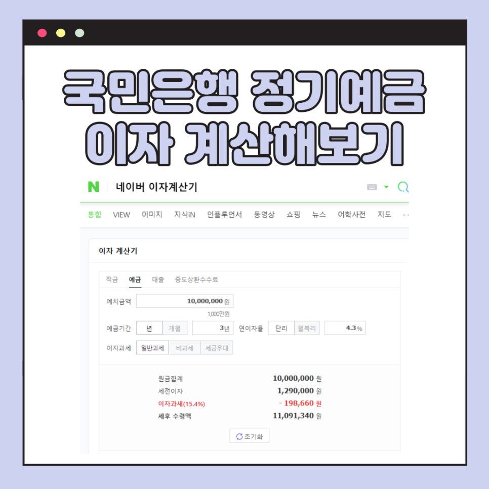 여기서 "예금"이란 요구불, 적립식, 거치식(시장성예금 포함)예금을 말하며 퇴직연금, 개인종합자산관리예금(ISA), 주택청약종합저축(청약저축 포함)제외됩니다. 본 상품으로 최고 4.2%의 금리를 적용받을 때, 1,000만원을 예치하면 얼만큼의 이자를 받는지도 계산해보겠습니다. 저는 주로 네이버 이자 계산기를 사용합니다.