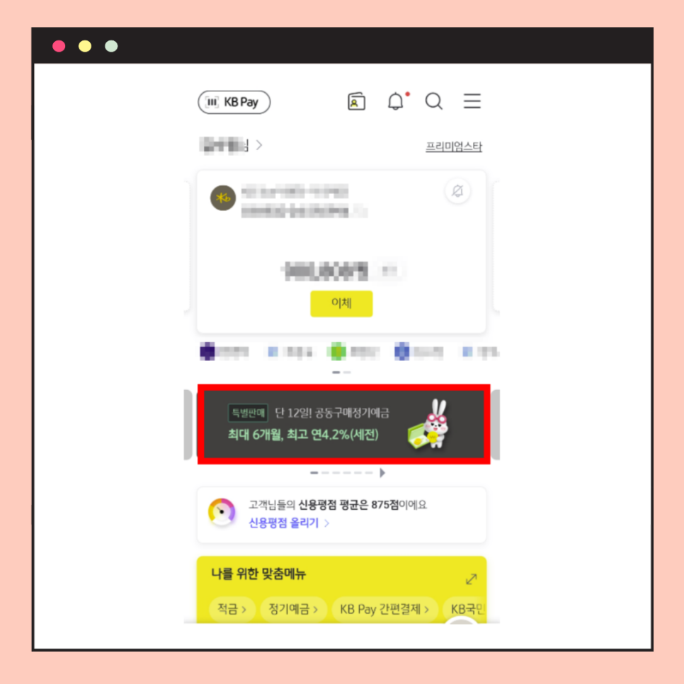 국민은행에서 현재 9월 26일부터 10월 7일까지 한정기간에 한하여 판매중인 특판정보는 어플 실행하자마자 배너로 광고중입니다. 배너를 통해 상품정보 확인한 후에 바로 가입도 하실 수 있으니 편리합니다. 보통 신협이나 새마을금고는 지점별로 금리가 상이하고 또 방문해서 가입해야 하는 특징 때문에 포기한 적이 많았는데, 이렇게 간단하게 가입할 수 있으니 정말 좋습니다. 앞으로도 종종 은행 어플을 많이 실행해보면서 좋은 정보 얻어야겠다고 생각해봅니다.