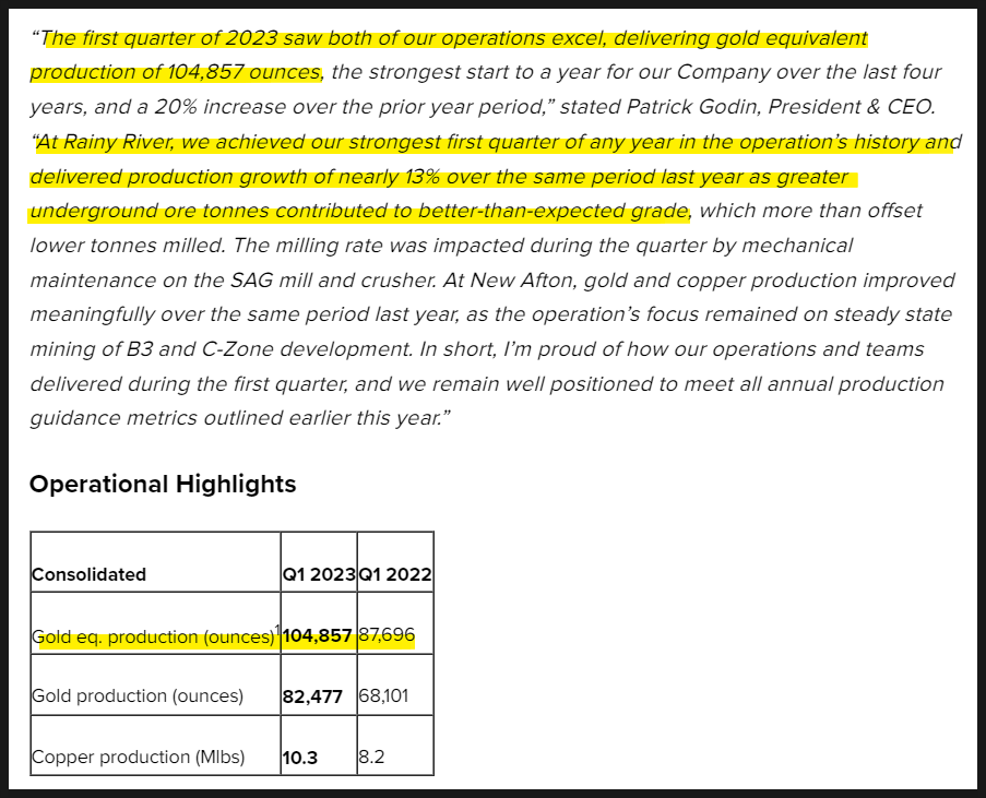 보고서에서 이 회사는 87,696온스에서 20% 증가한 104,857온스의 금을 생산했으며 New Afton 광산과 Rainy River 광산 모두에서 견실한 증가세를 보였다고 밝혔습니다.