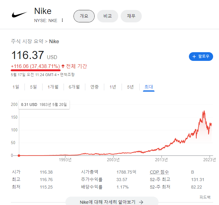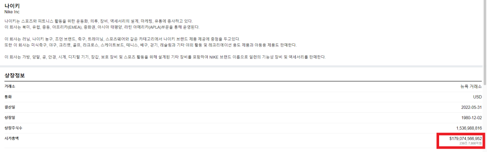 현재 나이키 시가총액은 한화로 약 240조원 정도하는 대기업입니다.