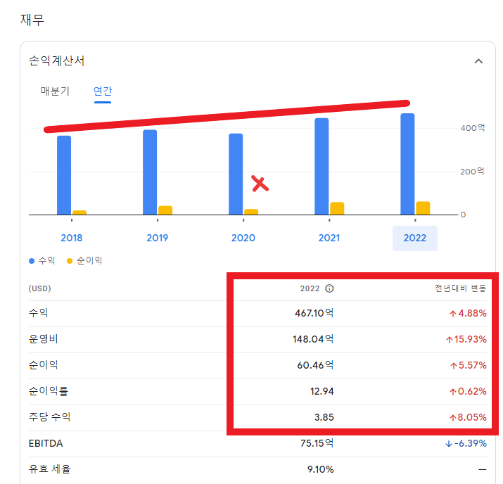 작년 대비로 수익과 순이익 둘 다 올라간 모습을 보여주고 있습니다.