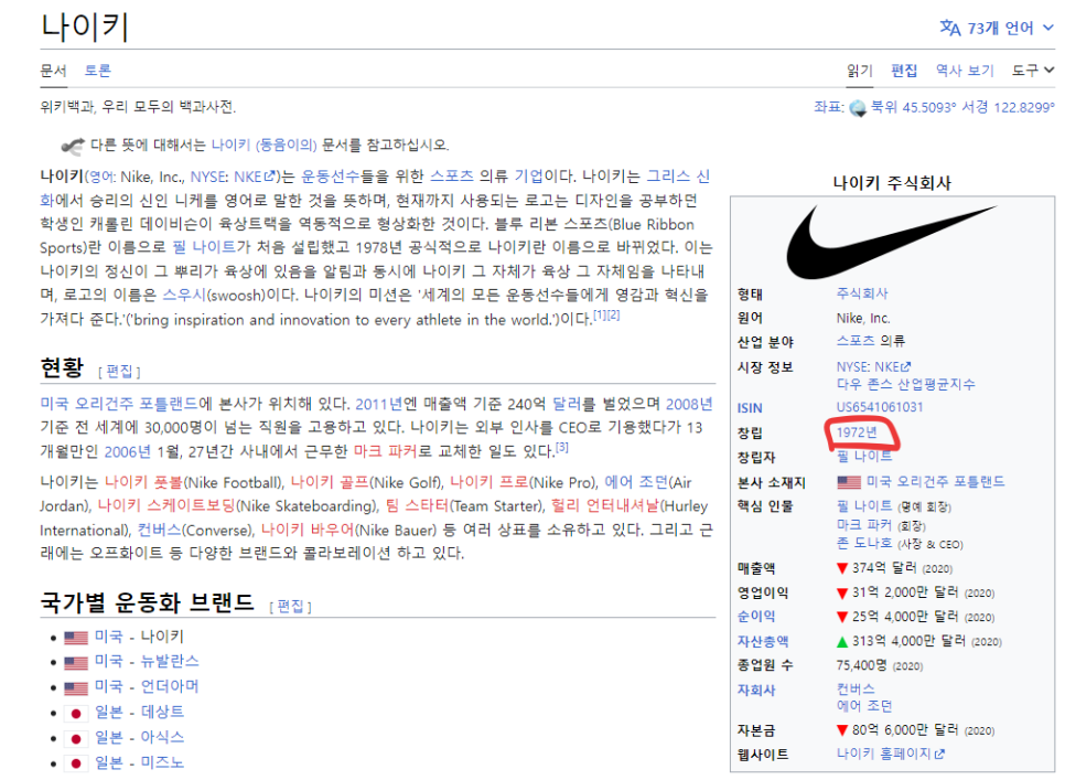 나이키는 1972년에 설립된, 즉 50년이 넘은 장수 회사입니다.