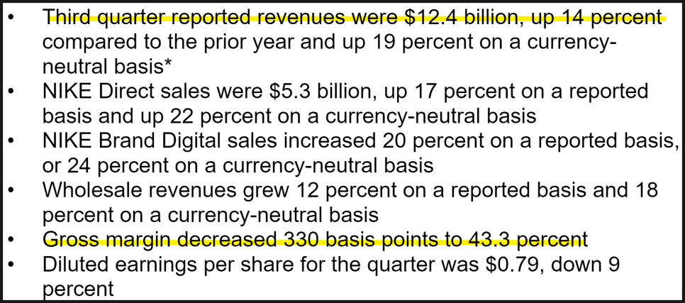 Nike는 2월 28일 마감된 분기 매출은 전년 대비 14% 증가한 124억 달러였습니다. 그러나 총 마진은 330bp 하락하여 EPS는 0.79달러로 전년 동기 대비 9% 감소하였습니다.