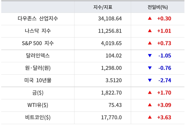 뉴욕증시는 13일(현지시간) 상승했다. 뉴욕증권거래소(NYSE)에서 다우지수는 전날보다 103.60포인트(0.30%) 상승한 3만4108.64로 마감했다. S&P500지수는 29.10포인트(0.73%) 뛴 4019.65, 기술주 중심의 나스닥 종합지수는 113.08포인트(1.01%) 오른 1만1256.81로 거래를 마감했다.