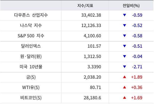 이날 국채금리도 하락했다. 미국 10년물 국채금리는 전일대비 10bp가량 하략한 3.33%선에서 거래됐다. 2년물 국채금리는 약 16bp 하락한 3.82%를 기록했다.
