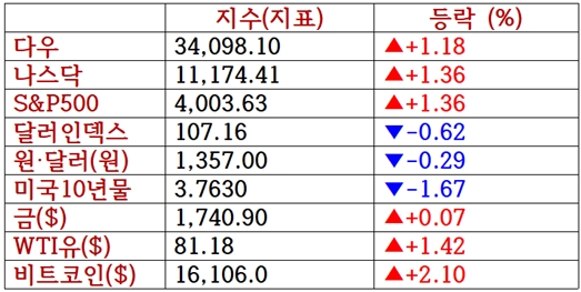 뉴욕증시는 22일(현지시간) 일제히 상승했다. 뉴욕증권거래소(NYSE)에서 다우지수는 전장 대비 397.82포인트(1.18%) 오른 3만4098.10에 거래를 마쳤다. 대형주 중심의 S&P500지수는 53.64포인트(1.36%) 높은 4003.58에, 기술주 중심의 나스닥지수는 149.90포인트(1.36%) 상승한 1만1174.41에 장을 마감했다.