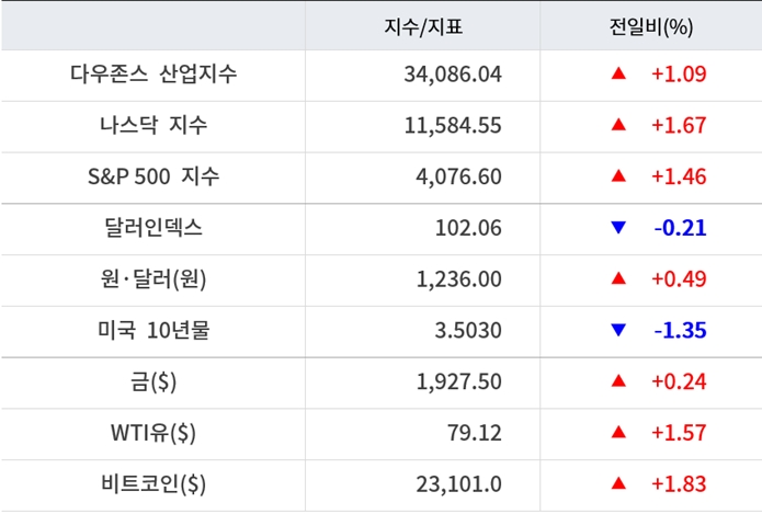 이날 국채금리는 하락했다. 미국 10년물 국채금리는 전일대비 1.35% 하락한 3.50% 선을 기록했다. 연준 통화정책에 민감한 2년물 국채금리는 1.36% 하락한 4.20% 수준에서 움직였다.