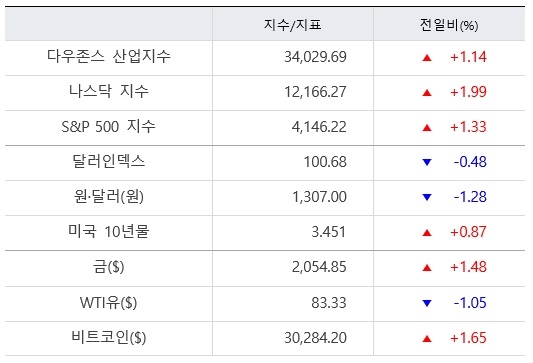이날 뉴욕증권거래소(NYSE)에서 다우지수는 전 거래일 대비 383.19포인트(1.14%) 오른 3만4029.69에 장을 마감했다. S&P500지수는 전장보다 54.27포인트(1.33%) 상승한 4146.22에, 나스닥지수는 전장보다 236.93포인트(1.99%) 뛴 1만2166.27에 각각 거래를 끝냈다.