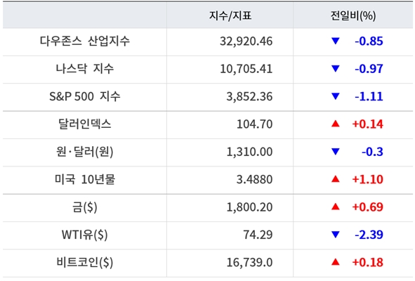 이날 뉴욕증권거래소(NYSE)에서 다우지수는 전장보다 281.76포인트(0.85%) 하락한 32,920.46에 거래를 마감했다. S&P500지수는 전장보다 43.39포인트(1.11%) 하락한 3,852.36에, 나스닥지수는 105.11포인트(0.97%) 내린 10,705.41에 거래를 마쳤다.