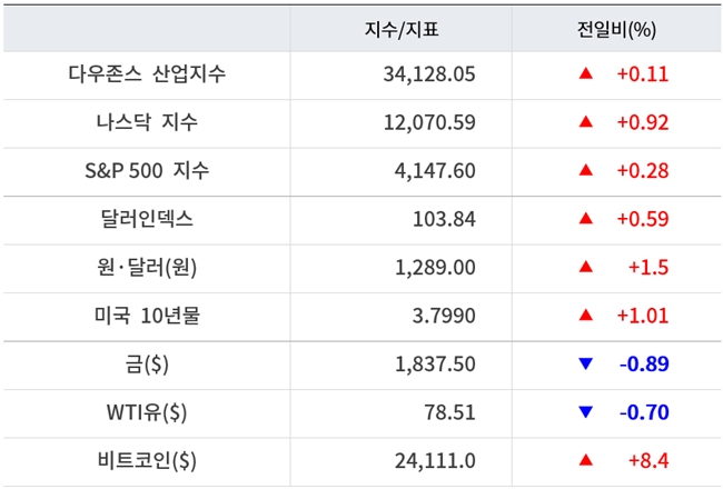 기술주의 주가는 엇갈렸다. 알파벳 2.39%, 애플 1.39%, 넷플릭스 0.41% 상승한 반면 메타 1.29%, 마이크로소프트 0.8% 하락했다.