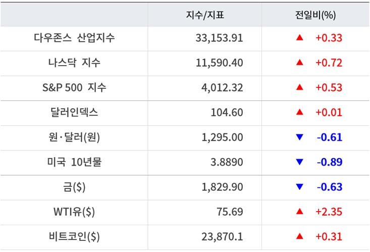 뉴욕증시는 23일(현지시간) 상승했다. 뉴욕증권거래소(NYSE)에서 다우지수는 전 거래일 대비 108.82포인트(0.33%) 상승한 3만3153.91에 마감했다. S&P500지수는 21.27포인트(0.53%) 상승한 4012.32에, 기술주 중심의 나스닥지수는 83.33포인트(0.72%) 오른 1만1590.40에 거래를 마쳤다.