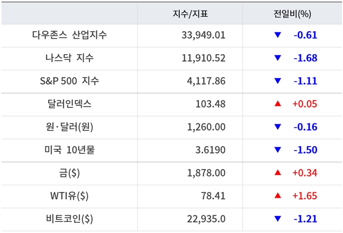 이날 국채금리는 하락했다. 미국 10년물 국채금리는 전일대비 1.5% 하락한 3.61% 선에서 거래됐다. 연준 통화정책에 민감한 2년물 국채금리도 전일대비 0.94% 하락한 4.42% 수준에서 움직였다.