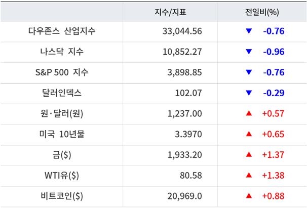 이날 채권 시장은 약세를 보였다. 연준 통화정책에 민감한 미국 2년물 국채금리는 장중 4.143%까지 올랐다. 10년물 국채금리는 장중 3.428%까지 뛰었다.