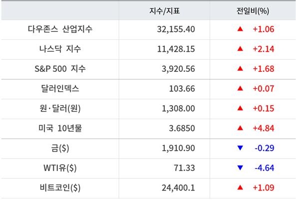 기술주가 상승, 애플 1,41%, 알파벳 3.14%, 마이크로소프트 2.71%, 넷플릭스 0.49% 올랐다. 메타는 이날 1만 명을 추가 감원하는 대규모 구조조정 발표에 7.25% 상승했다.