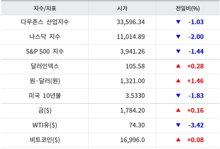 뉴욕증시, 금리상승·긴축우려 투심 악화 하락 ‘테슬라 6.37%↓’…유가·비트코인 하락 [출근전