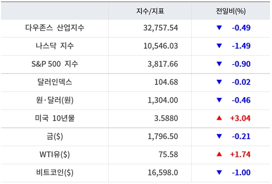페이스북 모기업 메타는 유럽연합(EU)이 메타가 반독점 금지법을 위반했다는 예비 의견을 내놓으면서 4.14% 폭락했다. 아마존은 3.33% 하락했다. 이외에도 알파벳이 2.02%, 애플이 1.59%, 마이크로소프트 1.73%, 엔비디아가 1.91% 하락 마감했다.