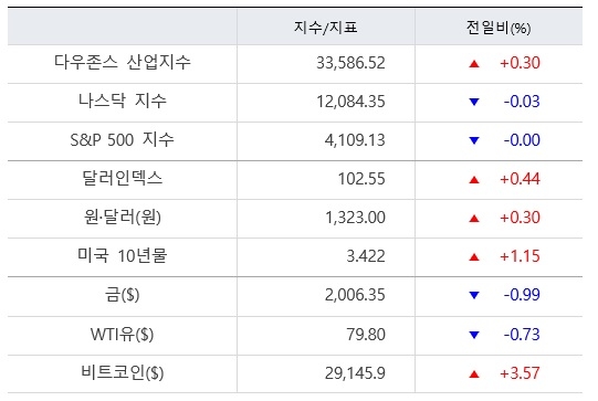 국채금리는 상승했다. 미국 10년물 국채금리는 전일대비 1.15% 상승한 3.422% 선에서, 2년물 국채금리는 전일대비 0.96% 오른 4.010% 수준에서 거래됐다.