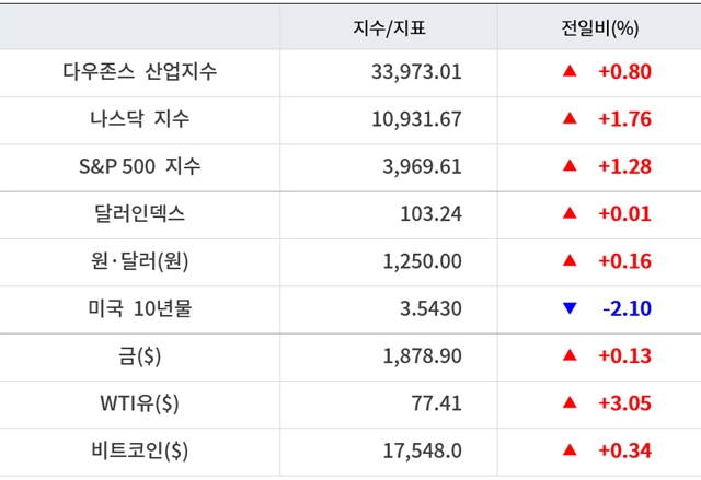 기술주가 급등했다. 애플 2.11%, 마이크로소프트 3.02%, 아마존 5.81%, 알파벳 3.51% 상승했다. 반면 넷플릭스와 메타는 각각 0.09%, 0.08% 하락한 약보합으로 마감했다.