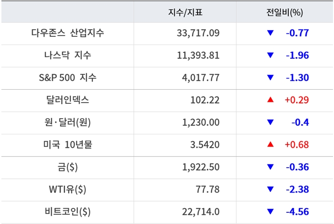 이날 국채금리는 상승했다. 미국 10년물 국채금리는 전일대비 0.68% 상승한 3.54% 선을 기록했다. 연준 통화정책에 민감한 2년물 국채금리는 0.74% 오른 4.23% 수준에서 움직였다.