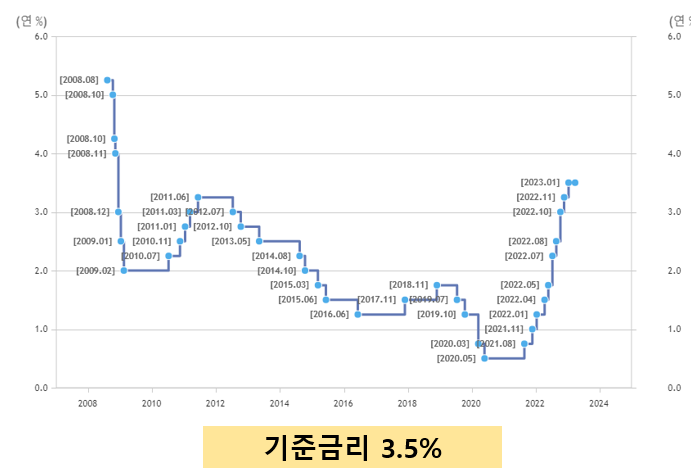 아래 그래프에서 볼 수 있듯이, 현재 기준금리 3.5%수준은 2010년도~2014년도 수준입니다.