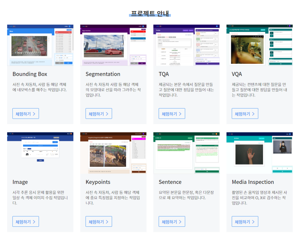 두번째 소개 해드릴 데이터라벨링 사이트 라벨온 입니다. 라벨온은 각각의 프로젝트들을 미리 체험할 수 있어요. 튜토리얼처럼 먼저 체험을 하면서 배운 다음 할당되는 프로젝트를 수행하는 방식입니다.