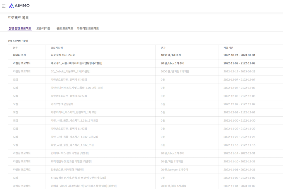 네번째는 에이모 입니다. 에이모는 초보자 분들은 툴사용이 조금 어렵다고 하시지만, 막상 익숙해지면 제일 편리하다고들 하셔요! 보통 모집을 하고 일을 할당받는데 순식간에 마감이 되기 때문에 빨리 지원하셔야 합니다. 그만큼 데이터라벨러 들이 많이 사용하는 데이터라벨링 사이트 입니다!