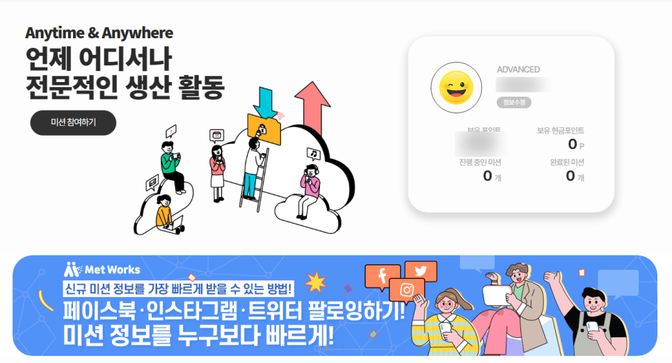 여덜번째, 메트웍스 입니다. 한동안 카톡대화하기 프로젝트를 진행해서 많은 데이터라벨러들이 참여했었는데요. 지금은 감정이 태깅된 자유대화를 모집하고 있습니다. 현재는 작업량이 많지 않은 것 같습니다.